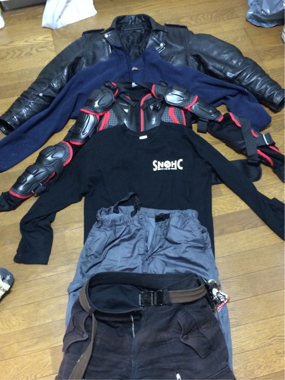 先日買ったプロテクターに防寒重ね着。アウターはダブルのライダースジャケット。